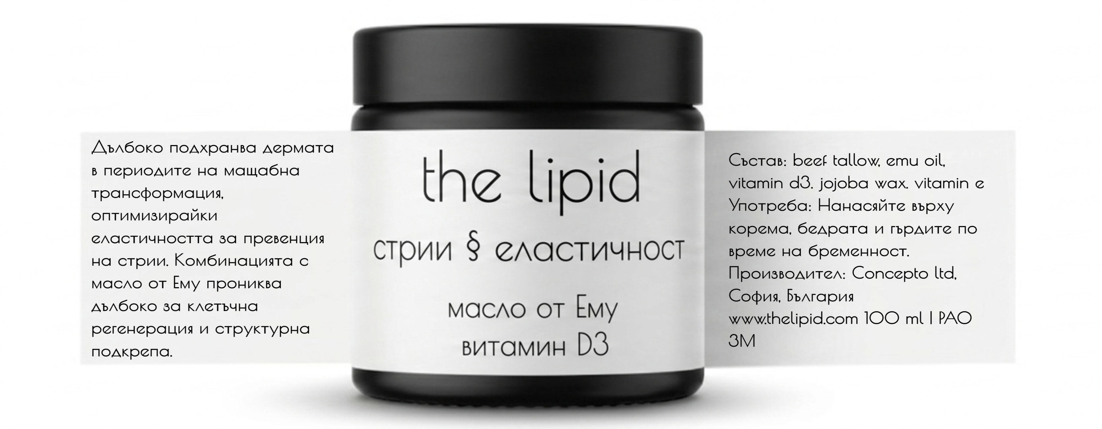 THE LIPID е структурна подкрепа, основана на биохимична логика. Чрез био-идентични липиди и пептиди, кожата мигновено разпознава ресурса и възстановява своята цялост. Тази грижа има три стълба:Липидна геометрия: Beef Tallow и масло от Ему доставят холестерол за изграждане на устойчива клетъчна „стена“. Мастнокиселинният им профил е идентичен със себума за пълна интеграция.Микробиомна защита: 0% синтетични консерванти за съхранение на живата екосистема и вродения имунитет на кожата.Терапевтична регенерация: Медни пептиди и Витамин D3 активират собствения оздравителен процес при стрии, белези и хронична чувствителност.